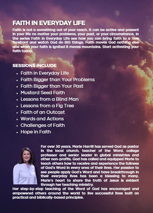 Faith is not a something out of your reach. It can be active and present in your life no matter your problems, your past, or your circumstance. In this 10-part series Faith in Everyday Life by Marie Harrill, you will learn how you can bring faith to the forefront and watch God do BIG things. Faith moves God, nothing else; and when your faith is ignited it moves mountains. Start activating your faith today.